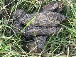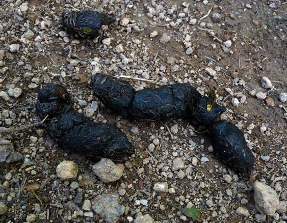 Coyote scat will often look similar to dog poop, but is larger and looks like it’s filled with debris. Usually you can see hair inside the scat. They resemble a cigar with shaped ends. See the photos below for reference.